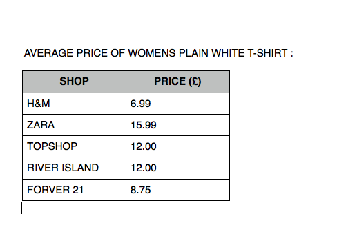 I created a positioning map to see where ZARA stands in relation to quality and price to their competitors. To gage an idea of where each brand should be placed I looked on each of their online stores to find out the average price of a basic plain white t-shirt. As you can see in the table above ZARA was actually the most expensive by far. However I shop their regularly and would not say that I find their products expensive especially compared to TOPSHOP. The positioning map below has been conducted to my personal shopping experiences as well the results from the table.